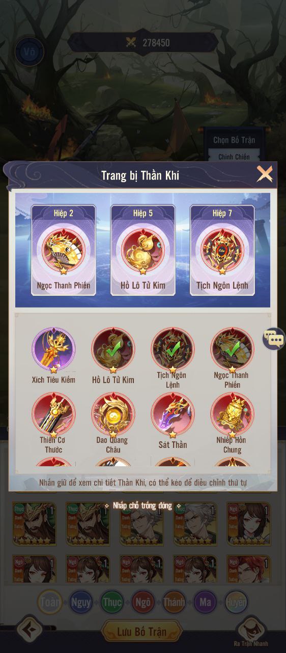 Trong Phong Hầu Tam Quốc, Thần Khí chính là những cổ bảo huyền thoại nắm giữ sức mạnh có thể xoay chuyển cục diện chiến trường. Không chỉ gia tăng chỉ số cho đội hình, mỗi Thần Khí còn sở hữu kỹ năng đặc biệt và hiệu ứng độc đáo, giúp tạo nên những bước ngoặt bất ngờ trong trận đấu. Khi được kích hoạt đúng thời điểm, Thần Khí sẽ trở thành chìa khóa chiến thuật, giúp các Thành Chủ lật ngược thế cờ và dẫn dắt đội quân đến chiến thắng vang dội trên chiến trường Tam Quốc! ⚔️🔥