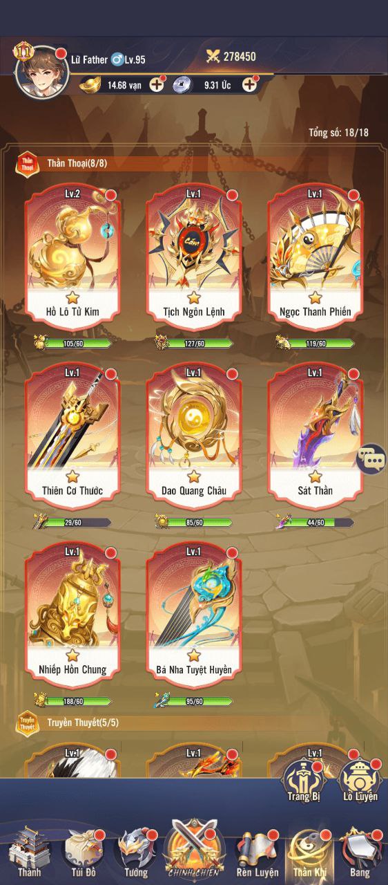 - Thông qua các tính năng Nâng Cấp, Nâng Sao và Rèn, người chơi có thể gia tăng sức mạnh, biến Thần Khí trở thành vũ khí tối thượng giúp chinh phục mọi trận đánh.