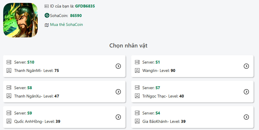 Bước 2: Chọn nhân vật và server bạn chơi: