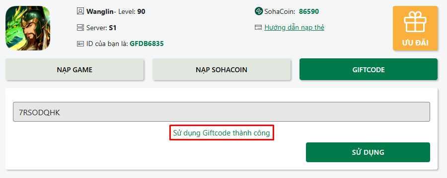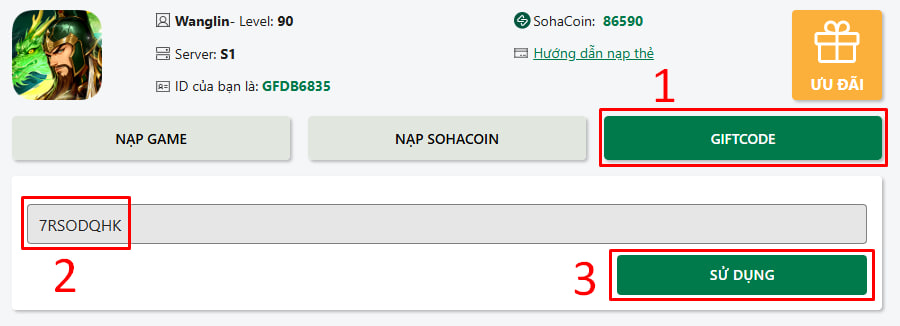 Nạp thẻ và nhập giftcode: https://nap.sohagame.vn/phonghautamquoc/pay